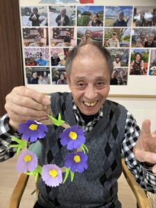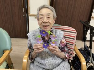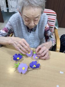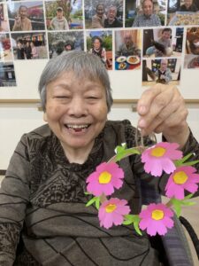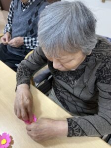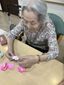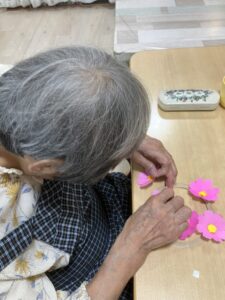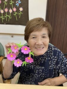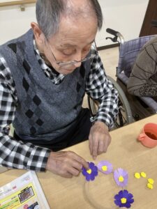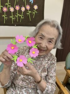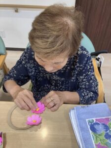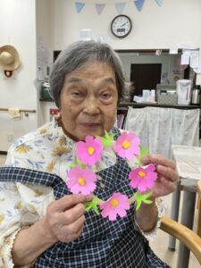 折り紙で作成したコスモスを、紙皿をリースとして貼り付けました