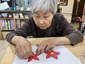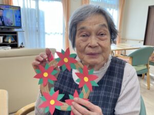 画用紙で作成したポインセチアを、リースに見立てた紙皿に