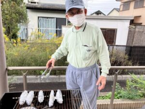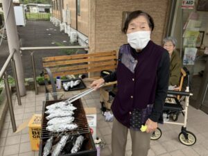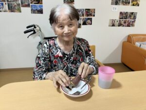 利用者様にも芋をトングでコロコロするのを手伝ってもらいました。