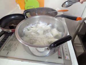 よく洗ったお米を入れて茹でる時間短縮の作り方です。