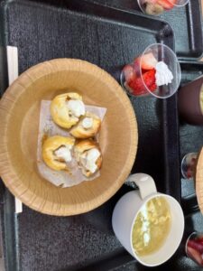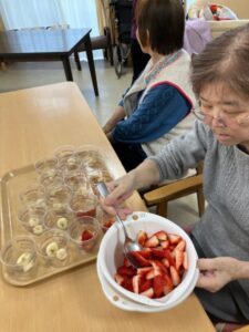 焼いている間は野菜スープの具材を切って頂いたり、デザートの果物を盛り付けて下さいました。