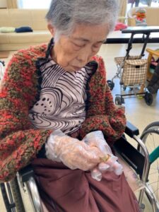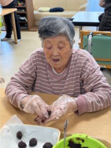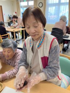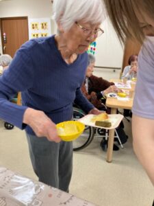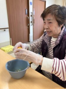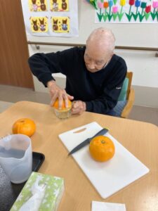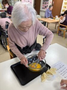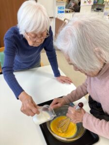 ご利用者様と一緒に作ります‼4チームに分かれてボウルでケーキ生地を泡だて器で混ぜたり新鮮なフルーツ絞り🍊