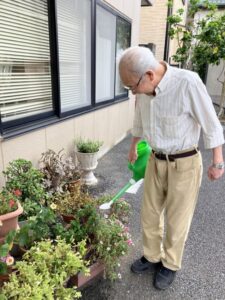 晴れの日には外でお花に水やり