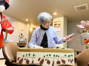 お芋やダミーの物が丸い緩和剤の中に埋もれていて、手を入れてお芋を探します。