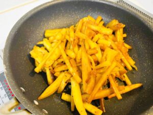 カットしたしたさつま芋を油で炒めてそのあとブラウンシュガーも油で炒めてからコーティング。