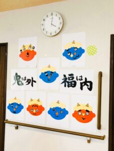 完成した鬼たちはご入居者がご自身の居室に持って帰ったり、フロアの壁に飾りました☺