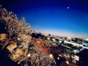 階段を登ると池上の街並みと梅を眺めることができます☺