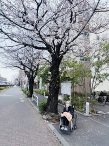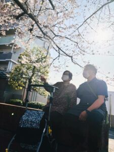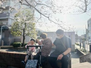 お散歩中、少し座ってひと息ついたりしながら桜を眺めたりして楽しまれていました☺