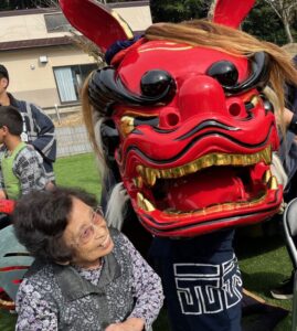 かつて入居者様は、毎年このお祭りで大活躍だった。祭りの運営の中心的な役割を担った方、獅子もみの指導を行った方、来客者のために豪勢な料理を準備した方、大事なわが子の手を引き、獅子や神輿、山車が一番よく見える場所を探して歩いた方。いまでも入居者様皆が、昨日のことのように【石岡のお祭り】の思い出話を語ってくれるほど。