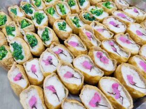 菜の花そして桜の塩漬けを添えた稲荷寿司、けんちん蕎麦、春野菜のかき揚げが本日のメニュー♪