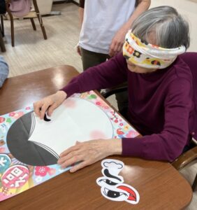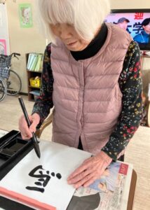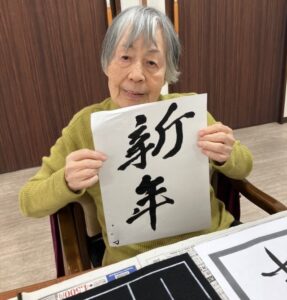 ホームでは、書き初め、コマ回し、福笑い、