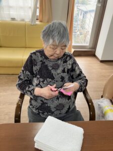 印をつけた折り紙とハサミをお渡しすると丁寧に切り抜いて下さいました。