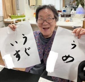 また、春にちなんだ言葉をテーマにした習字の時間も楽しまれ、皆様集中して筆を動かされていました。