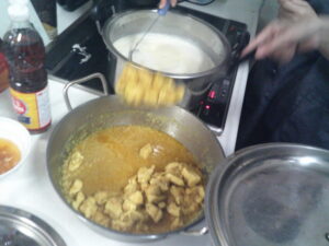 炒めた鶏肉をココナッツミルクの入った鍋へ入れます。