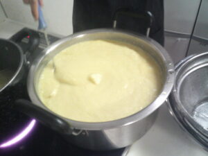 ・別鍋の水、ココナッツミルク、ひよこ豆のパウダーを入れてかき混ぜる。