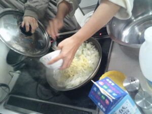 ・鍋に油を入れて、玉葱を炒める。