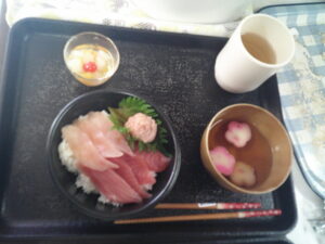 恒例?お寿司。思考を変えて鮪丼・花麩のお吸い物・フルーツ缶に、いたしました。何なに何かあったの?