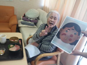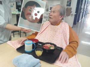 合間に福笑いをしてみました。変な顔と言われながら、写真撮影に参加してくださいました。