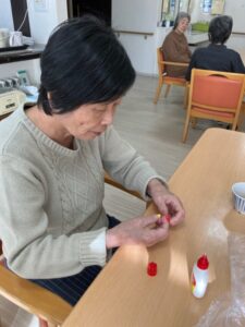 色とりどりの折り紙を丸めて、梅の花を作ります。