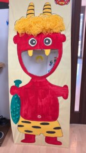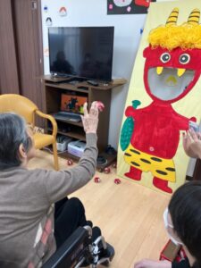 その後 鬼型パネルに玉入れをしました。