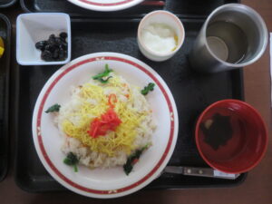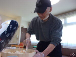 入居者様に昼食のちらし寿司のお手伝いをして頂いています。
