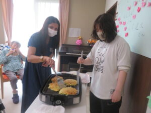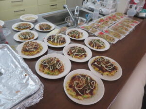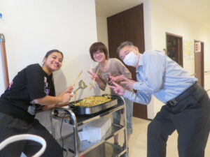 2人を迎えるために、お好み焼き・焼きそばパーティーを企画しており、天気も良かったので急遽外で食べる事にしました。