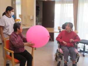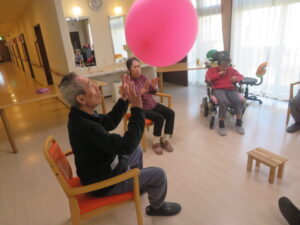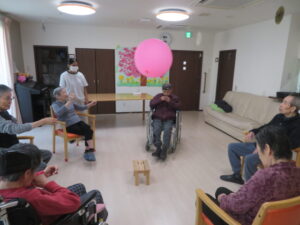 バレーをしたり、風船を回したりして大きな輪を作って皆さまと遊びました。