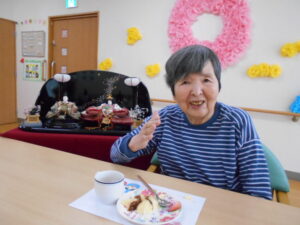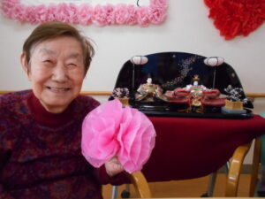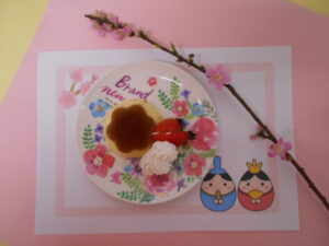 かわいらしいピンクのお花で飾りつけしたあと、ひな祭りの歌を歌って、お楽しみのおやつタイム♪