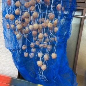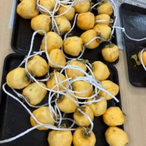 ヘタを紐につけて