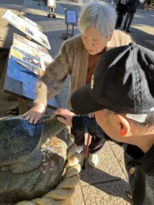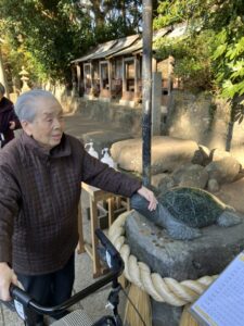 有名なカメさんをスリスリ