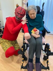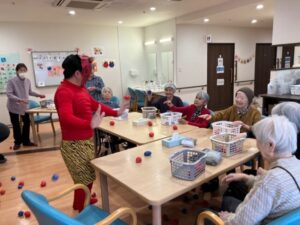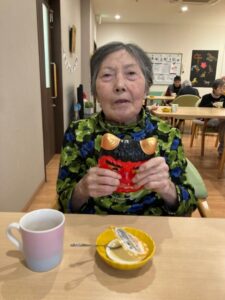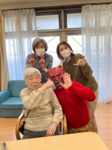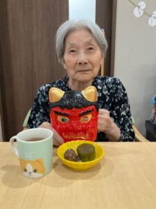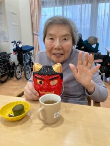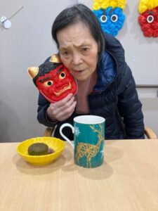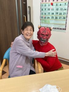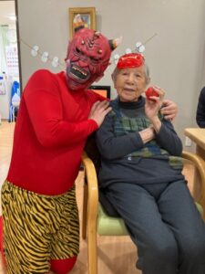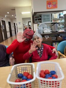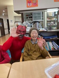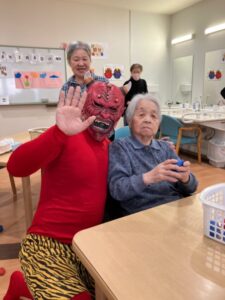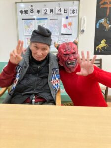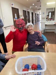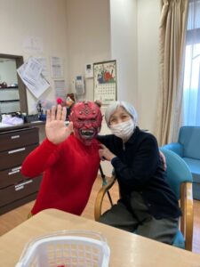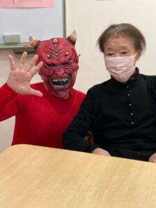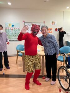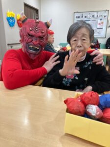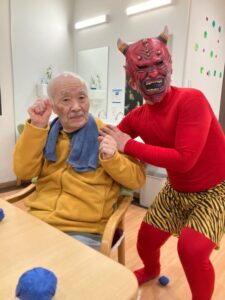 リアルな赤鬼に扮して登場すると、最初は怖がられていたご利用者様も、すぐに笑顔に😊