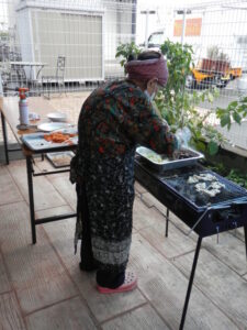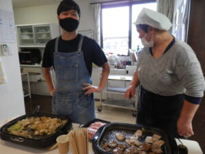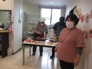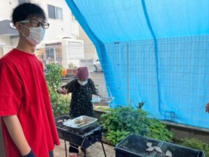 入居者様が縁日で遊んでいる間、スタッフがBBQの準備をしています。