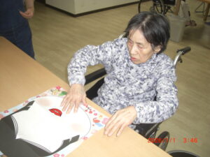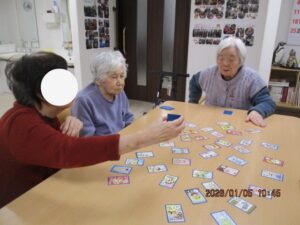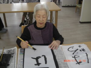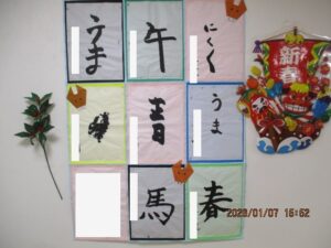 お正月にはかるた取り、習字、福笑いを楽しまれました。