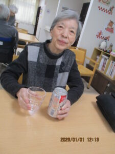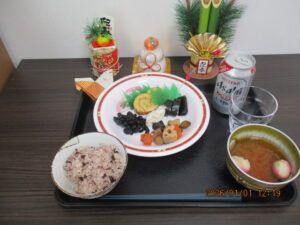 お正月にはおせち料理を召し上がって頂きました。ノンアルコールビールを飲んで頂き「久々に飲んだわぁ~美味しい」と喜んで頂けました。