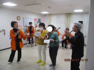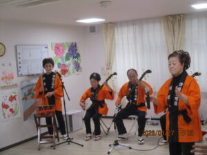 1月27日津軽三味線のボランティアの方に来て頂き、皆様手拍子をされたり歌を唄われたりと楽しまれておりました。「威勢が良くて元気になるわぁ~‼」とお声が聞かれました。