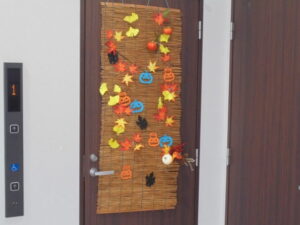 玄関入っていただくとすだれに紅葉やイチョウ、ハロウィンの小物を施した
