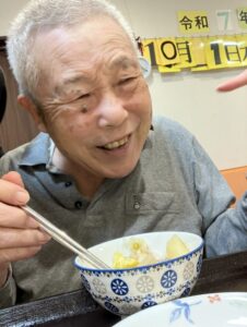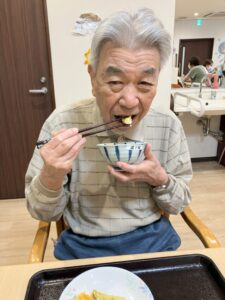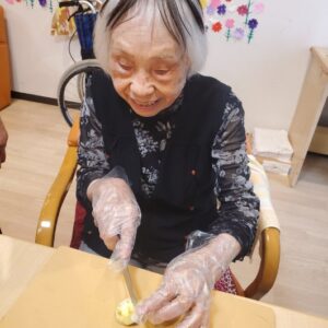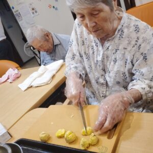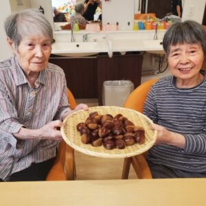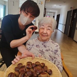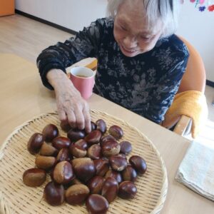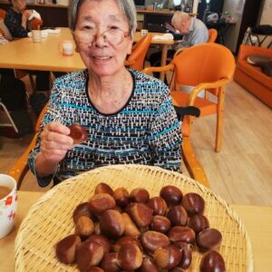 栗を下茹でした後は、入居者様に栗を半分に切って