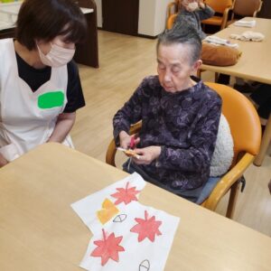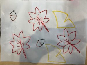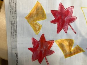 最初半紙に紅葉やイチョウの絵を描き