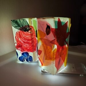 ライトをつけると、紅葉・イチョウ・りんごの絵が