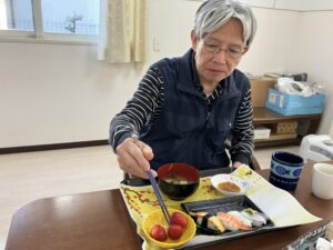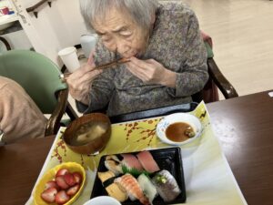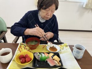 昼食に、握り寿司と苺を食べていただきました。