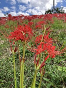 秋の彼岸のころ(9月)に赤い花を咲かせます。群生していてとてもきれいです。