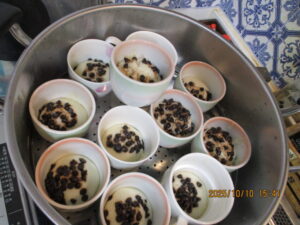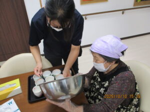 みなさんで「蒸しパン」作り。パンの生地を容器に流し込み・・・