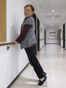 「こうやってつかまって、つま先立ちすると良いんだよ!」