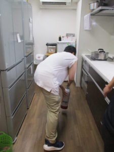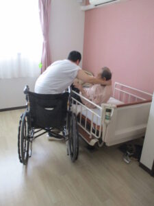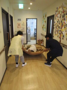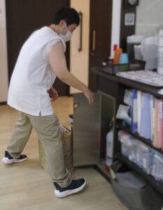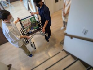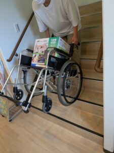 これは重いものを車椅子にのせて行いました