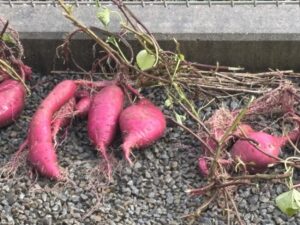 堀りたてのさつまいもを見ながら、