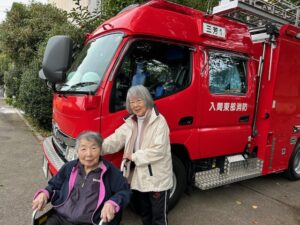 ピカピカの消防自動車を目の前に『まぶしい赤よネ~。こんなに赤いとびっくりするわよネ~』と、とても嬉しそうでした( *´艸`)