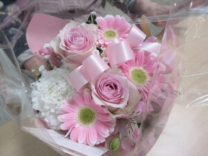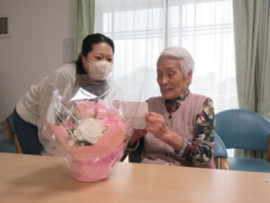 遠方にお住いの娘様から、お祝いのお花が届き、嬉しそうにメッセージカードを読まれます!