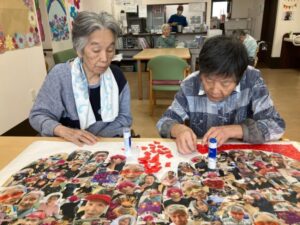 こちらは皆さんの顔が貼られた模造紙に💛マークの貼り絵ですね。
