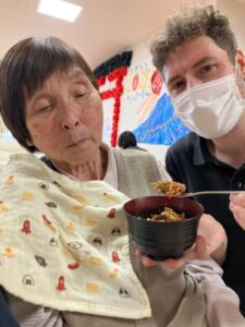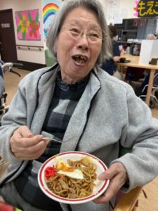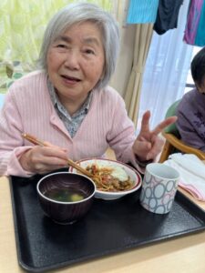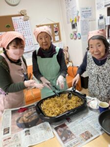 こちらは1階のみなさんです。エプロンを付けて一緒に調理、うまく出来ましたか?