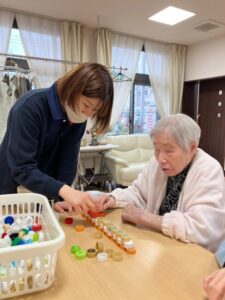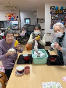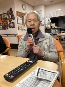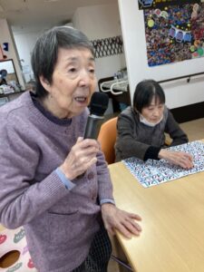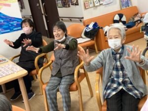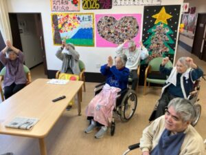 みなさんで体操をしていますね。車いすの方も座って出来る体操をして、体を動かしています。